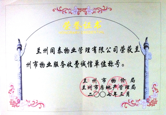 兰州市物价局、兰州市房地产管理局为我司颁发兰州市物业服务收费诚信单位称号荣誉证书。