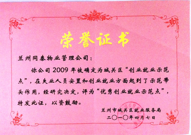 兰州市城关区就业服务局为我司颁发”优秀创业就业示范点“荣誉证书。